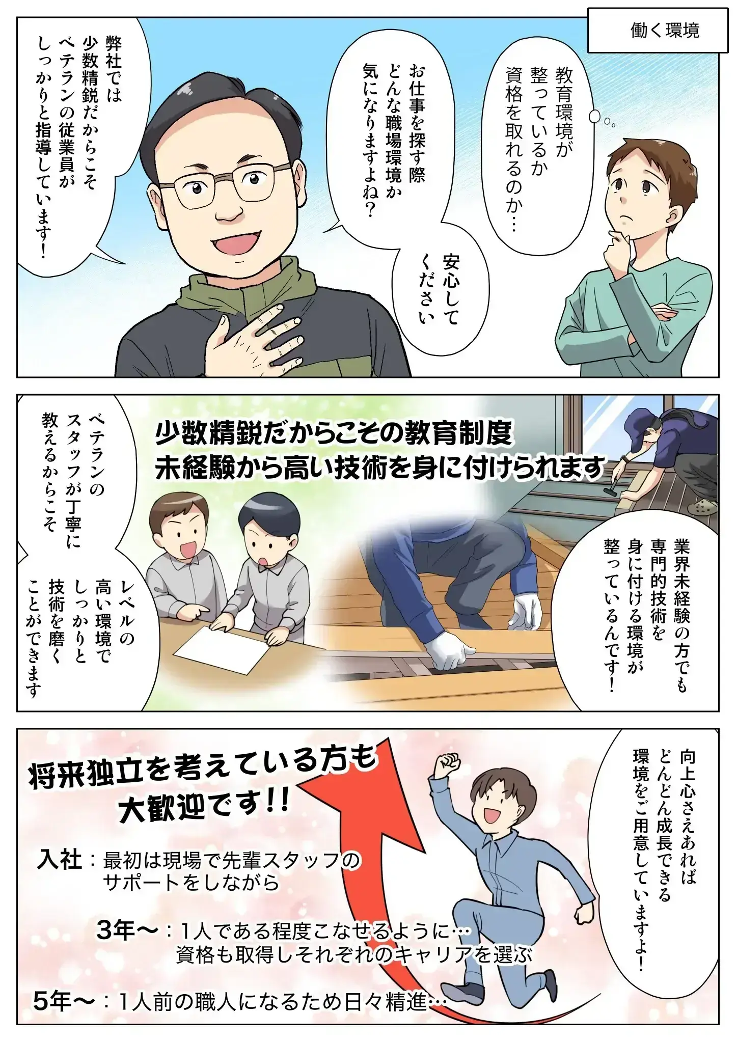 1人前の職人になるため日々精進しているフェーズです。独立を考える人もいます。会社が独立支援もおこなうのでご安心ください。